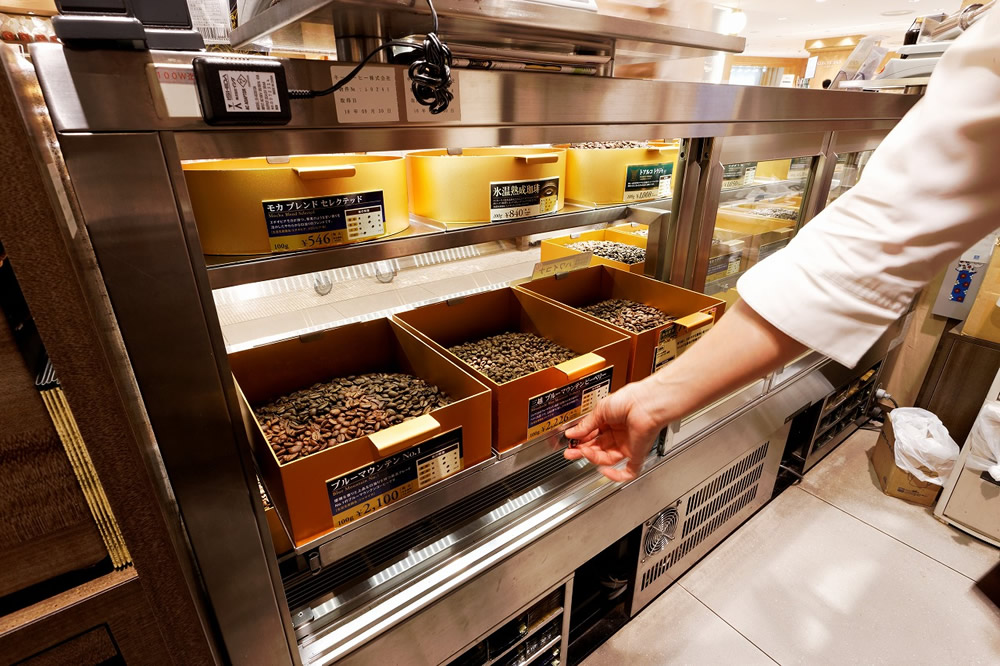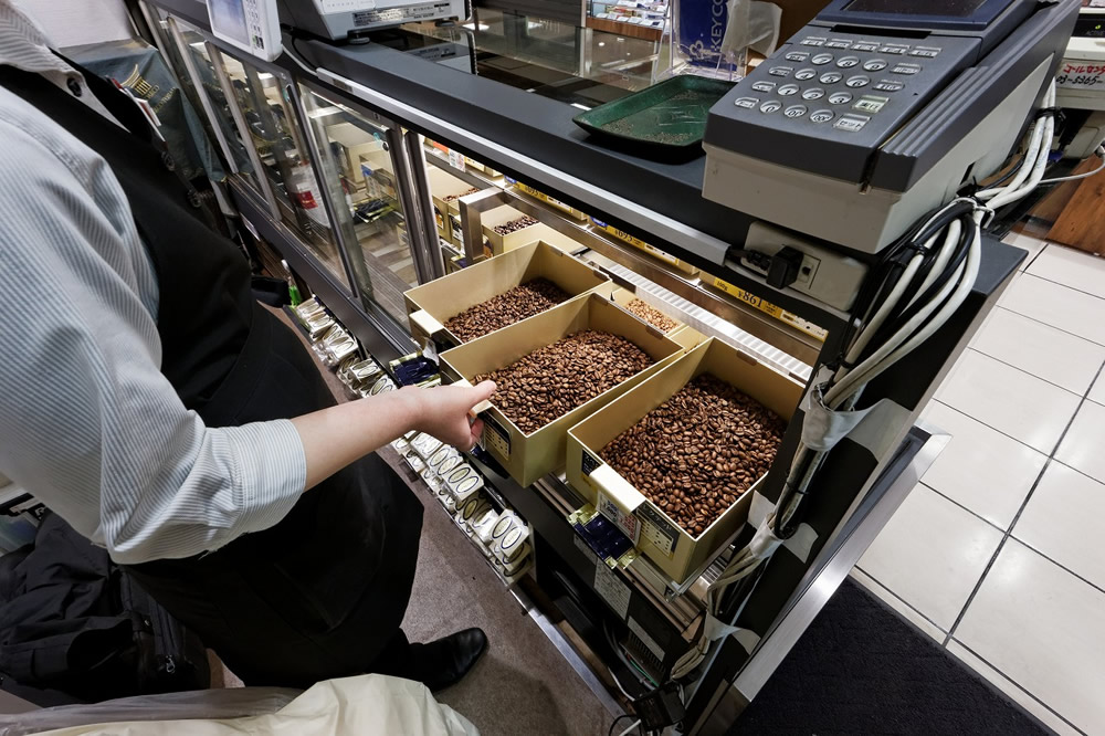 特注の豆トレーをアルマイト加工し高級感を演出。豆の鮮度をキープするため、湿度を下げた運転の特注仕様です。また豆トレーの下部にドロワーを採用し、豆の出し入れをしやすく工夫しました。
