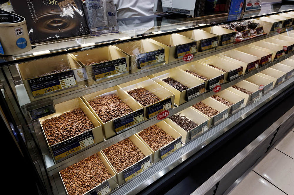 ガラスはシングルになって商品がより自然に、全ての棚の商品が見渡せる角度で設計しています。又湿度を抑えた豆に優しい運転と、中棚と底板がドロワー式で商品の出し入れし易いのが特徴です。
