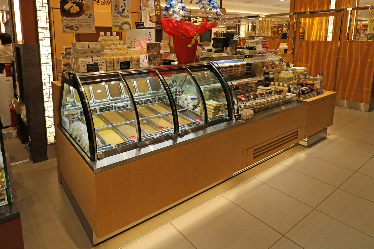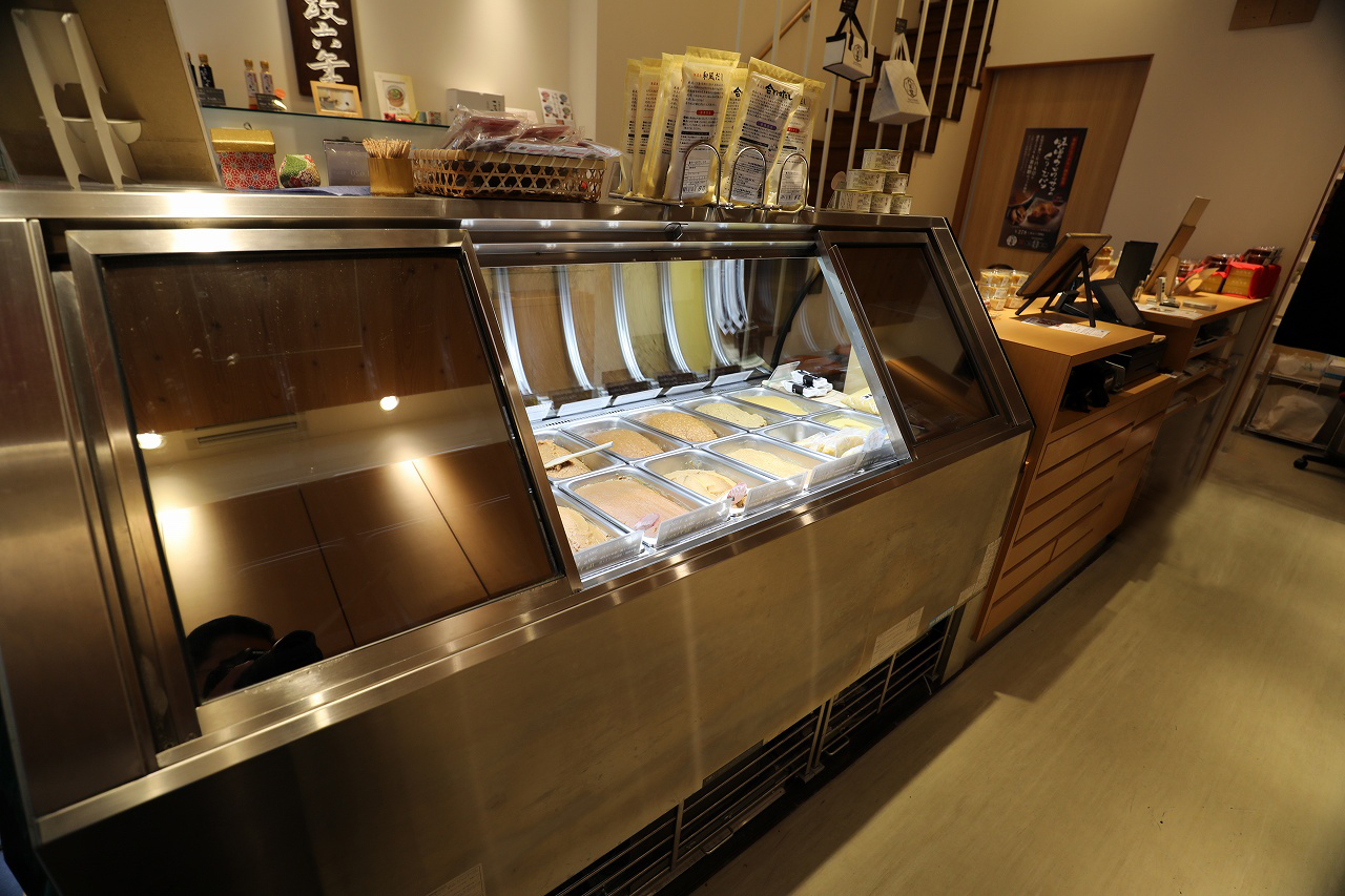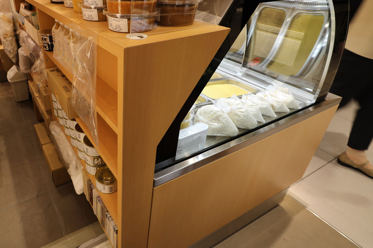 洋風のケースでありながら、和の味噌が綺麗に映える和洋折衷デザイン。味噌の鮮度を保つことはもちろん、庫内の両サイドに他の商品を陳列できるスペースや背面にショーケースの形に合わせた造作棚を設置する等、商品の魅せ方や作業性を考慮しました。