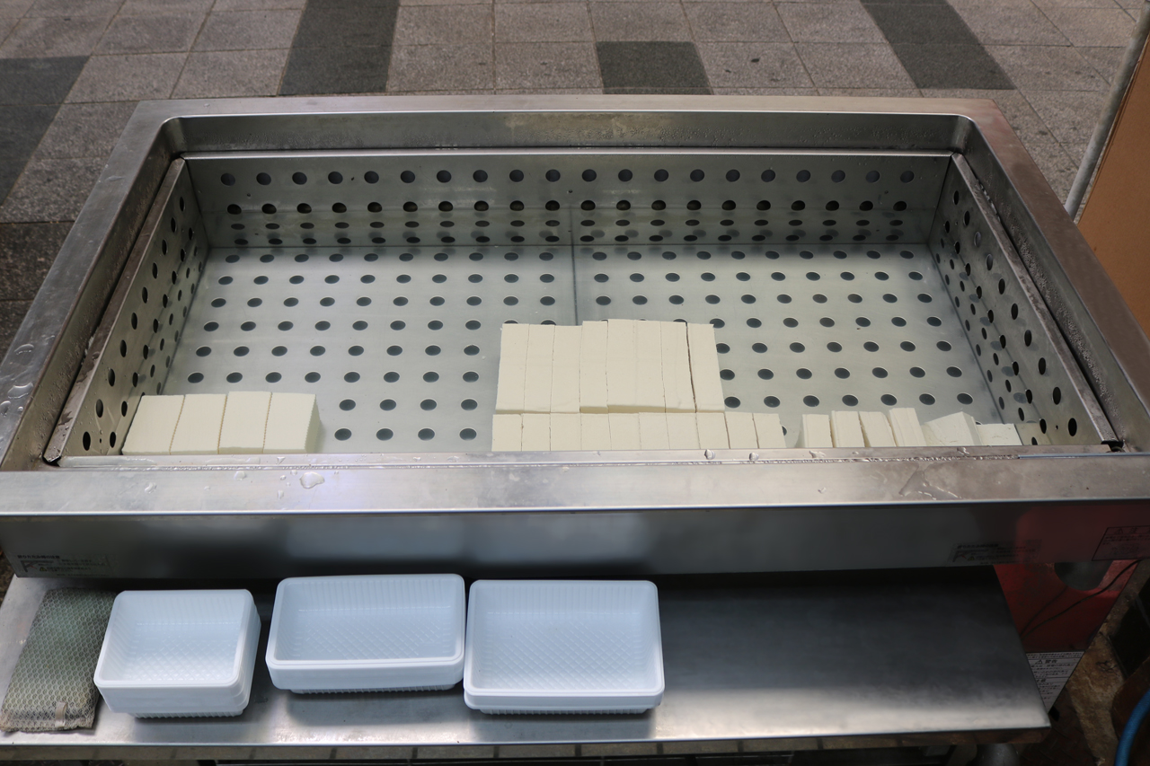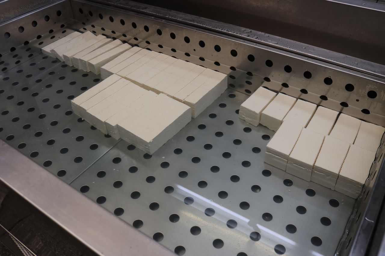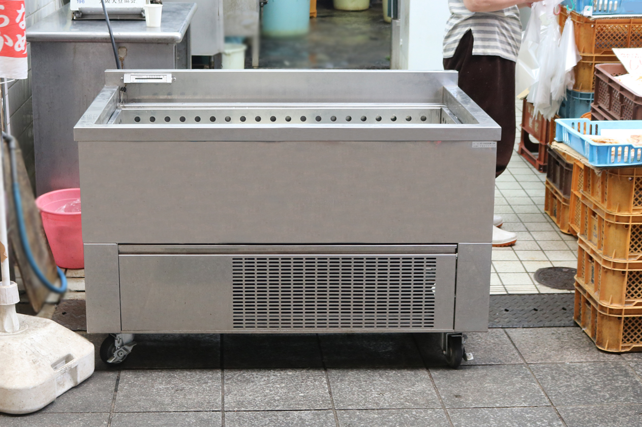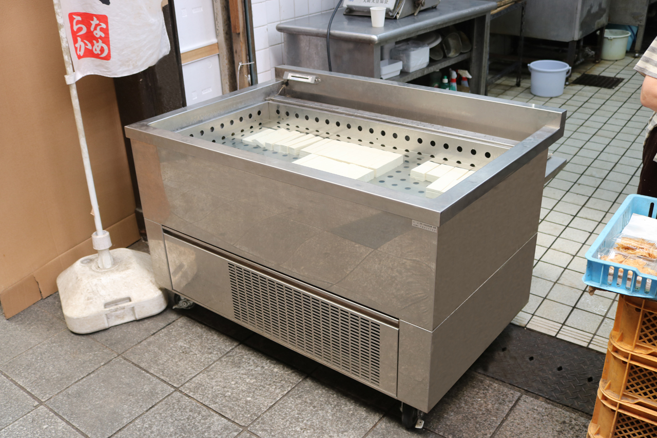 庫内の水を低温に保つ豆腐用冷水ケース。移動が容易なキャスターや作業しやすいよう天板の取付け等、作業効率のことも考えられた仕様です。