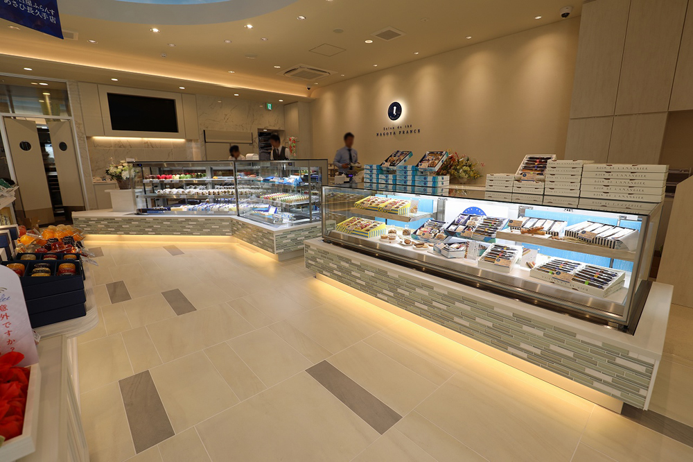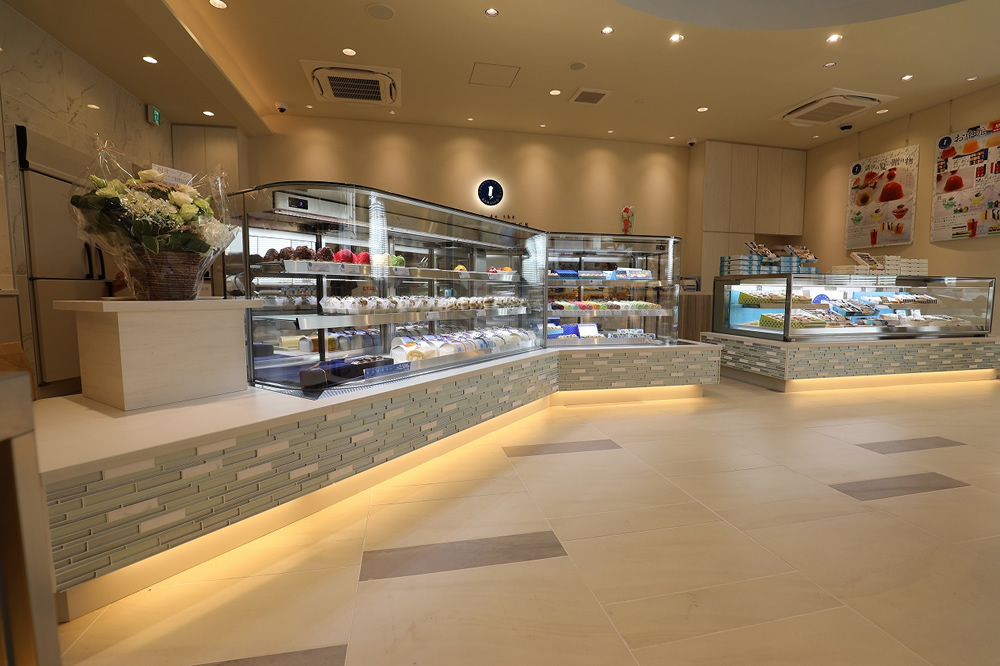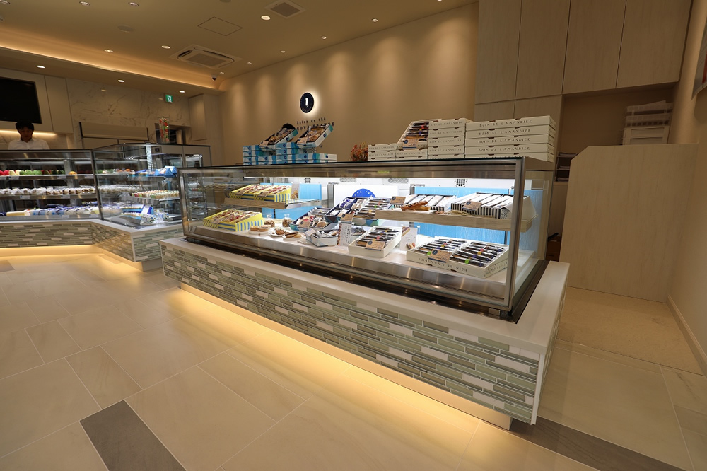 腰板はモロゾフ様オリジナルデザイン。照明付きで、腰部のガラスタイルをより美しく立体的に 。また正面手前アッパーライトにより商品に光を当てることで、演出効果を高め、商品の価値を引き立たせます。