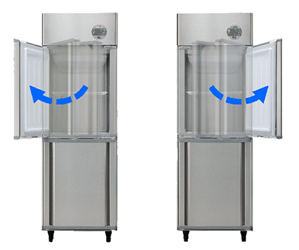 1枚の扉が右にも左にも開く両開き扉冷蔵庫。