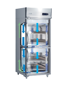 品質劣化の原因である庫内温度の変化を常にチェックし、±0.5℃の範囲(扉無開閉時)をキープすることできめ細かに鮮度を管理します。業界初の扉の中にも冷気が流れる“6面壁面冷却方式”により、冷却スピードと温度分布性能がアップ。