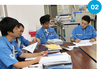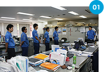 朝礼後、その日にまわるお客さまの情報と行動予定をミーティングで確認。システムによりきちんと整理された顧客データに基づき、適切なご提案やツールの選定が行われる。